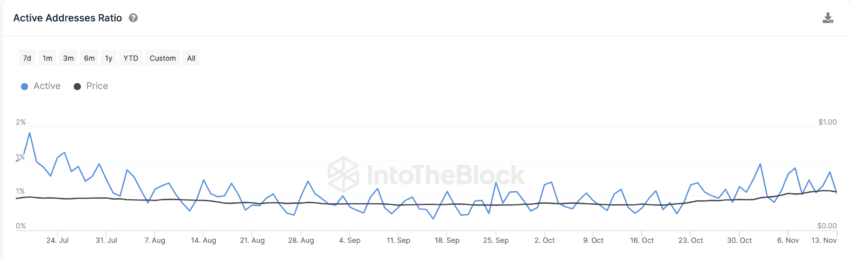 Menariknya, peningkatan aktivitas transaksi tidak hanya terbatas pada pendatang baru saja. Pasalnya, pembacaan data on-chain menunjukkan bahwa partisipan lama atau yang sudah ada juga melakukan jumlah transaksi yang sangat tinggi. Seperti yang tergambar di bawah ini, rasio alamat aktif Cardano memiliki tren di atas 0,8% dalam 10 hari terakhir, terhitung sejak tanggal 5 November.