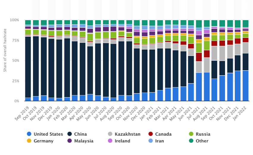 Hal ini mengingatkan kembali pada gerakan Cina yang melarang operasi crypto mining. Padahal sebelumnya, Cina sempat memegang mayoritas daya hash mining di seluruh dunia hingga tahun 2021, seperti yang bisa kita lihat pada plot di bawah ini: