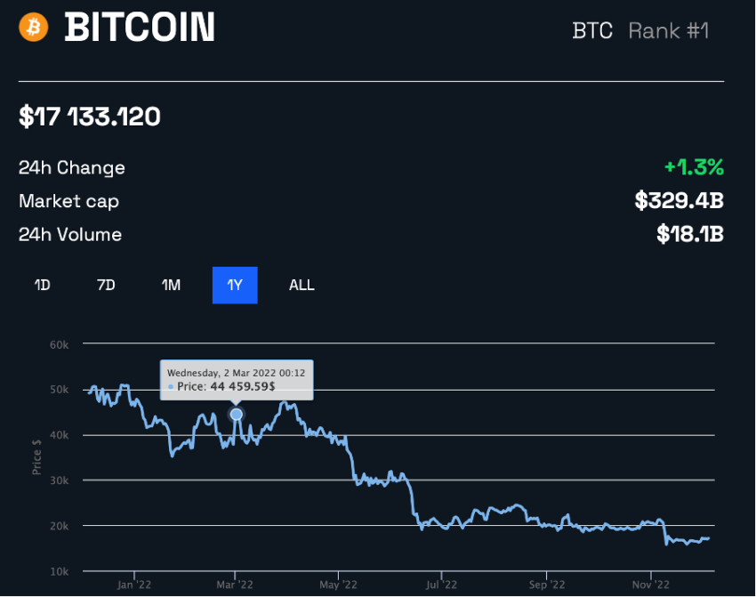 Sedangkan saat ini, kita dapat melihat bahwa aset kripto telah mengalami kerugian yang drastis. Bitcoin diperdagangkan di sekitar level US$17.000, menandai aksi turun sebanyak 75% dari level tertingginya sepanjang masa (ATH) di titik US$69.000 pada November 2021.