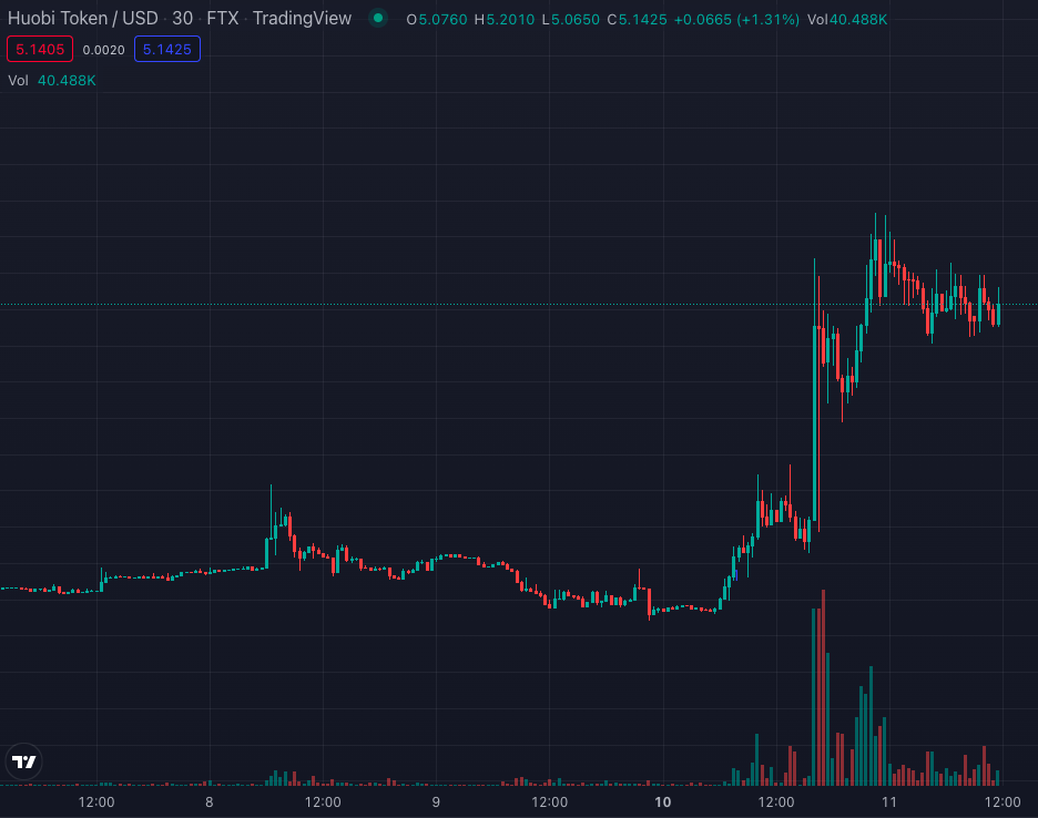 Berdasarkan pantauan hingga hari Selasa (11/10) pukul 10:45 WIB, harga token HT berada di level US$5,1 atau naik 22,89%, bila dibandingkan ketika WuBlockchain menebar informasi bahwa Justin Sun dan didukung SBF adalah ‘pembeli asli’ Huobi Global.