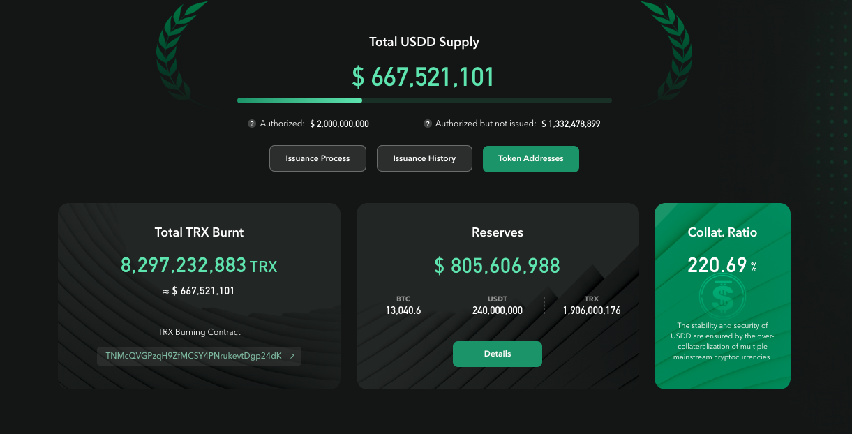 Berdasarkan pantauan baik di situs web TRON DAO Reserve (TDR), CoinGecko, dan CoinMarketCap, total pasokan stablecoin USDD yang beredar mencapai sekitar US$667 juta pada 6 Juni 2022. Sementara menurut TDR, collateralization ratio atau rasio jaminan untuk mendukung USDD saat ini mencapai sekitar 220%.
