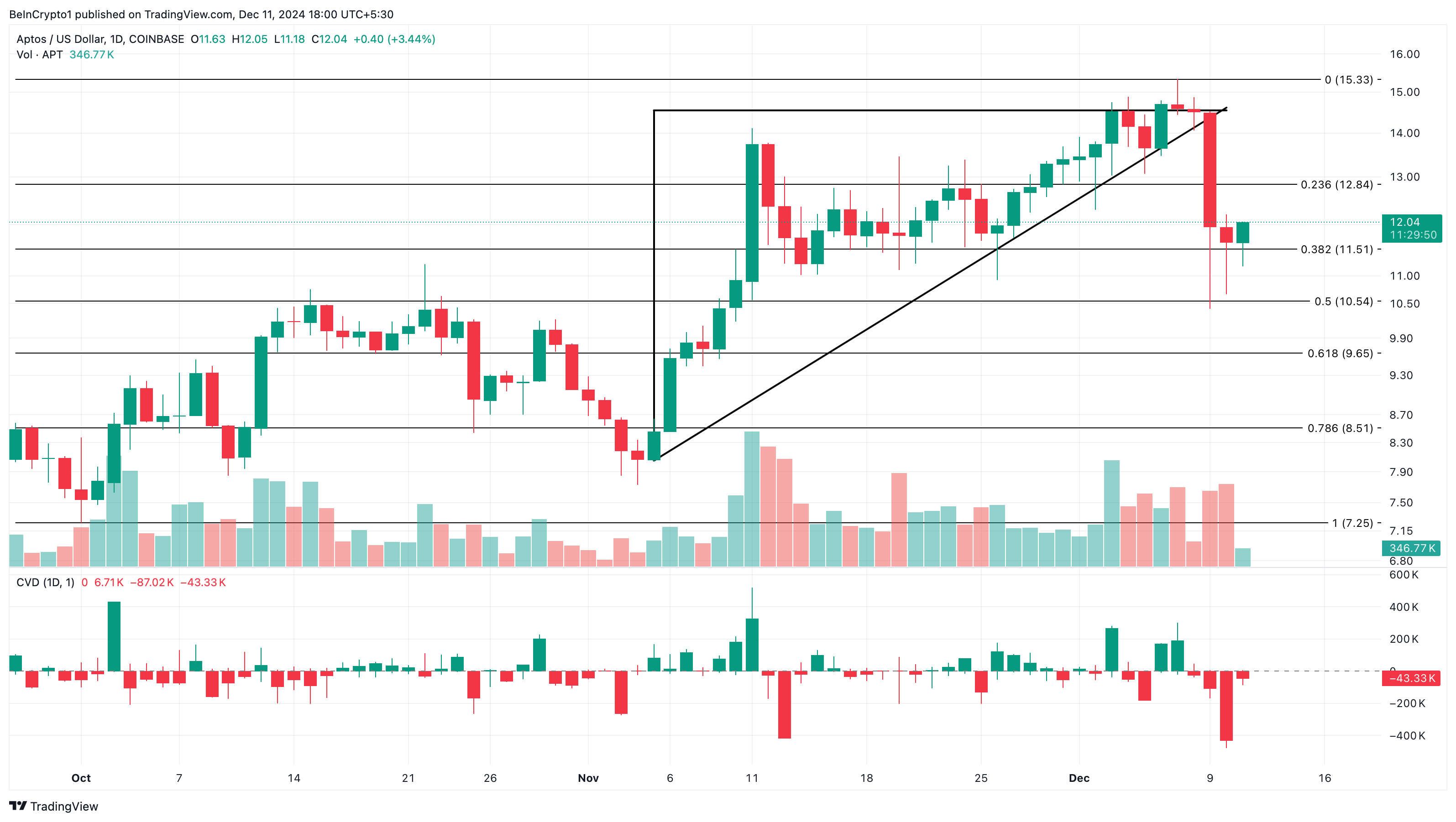 Beberapa hari yang lalu, harga Aptos diperdagangkan dalam pola segitiga naik. Segitiga naik biasanya bullish, menunjukkan bahwa tren naik mungkin berlanjut. Namun, pada saat ini, altcoin telah turun secara signifikan di bawah garis leher pola teknis, menunjukkan bahwa breakout bullish telah dibatalkan.