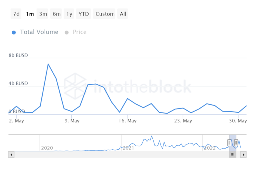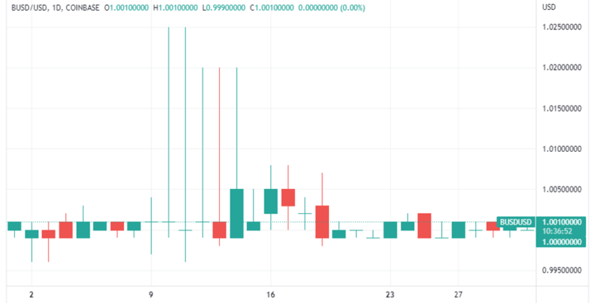 Harga pembukaan BUSD pada tanggal 1 Mei adalah US$0,9994. Stablecoin ini menunjukkan pencapaian tertinggi bulanan di level US$1,02 ketika 12 Mei. Lalu, juga menguji level harga terendah bulanan, yaitu US$0,9978 pada tanggal 9 Mei. BUSD menutup bulan yang sama dengan harga perdagangan senilai US$1. Secara keseluruhan, ada peningkatan sebesar 0,6% pada harga pembukaan dan penutupan BUSD di bulan Mei lalu.