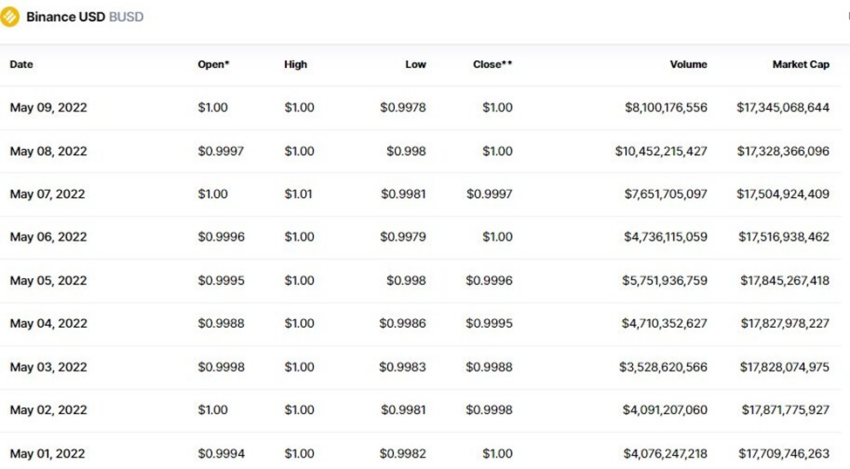Pada tanggal 12 Mei, BUSD diperdagangkan pada harga US$1, mencapai level perdagangan tertingginya pada titik US$1,02 dan telah menguji titik perdagangan harian terendah di level US$1. Lalu, menutupnya dengan harga US$1.