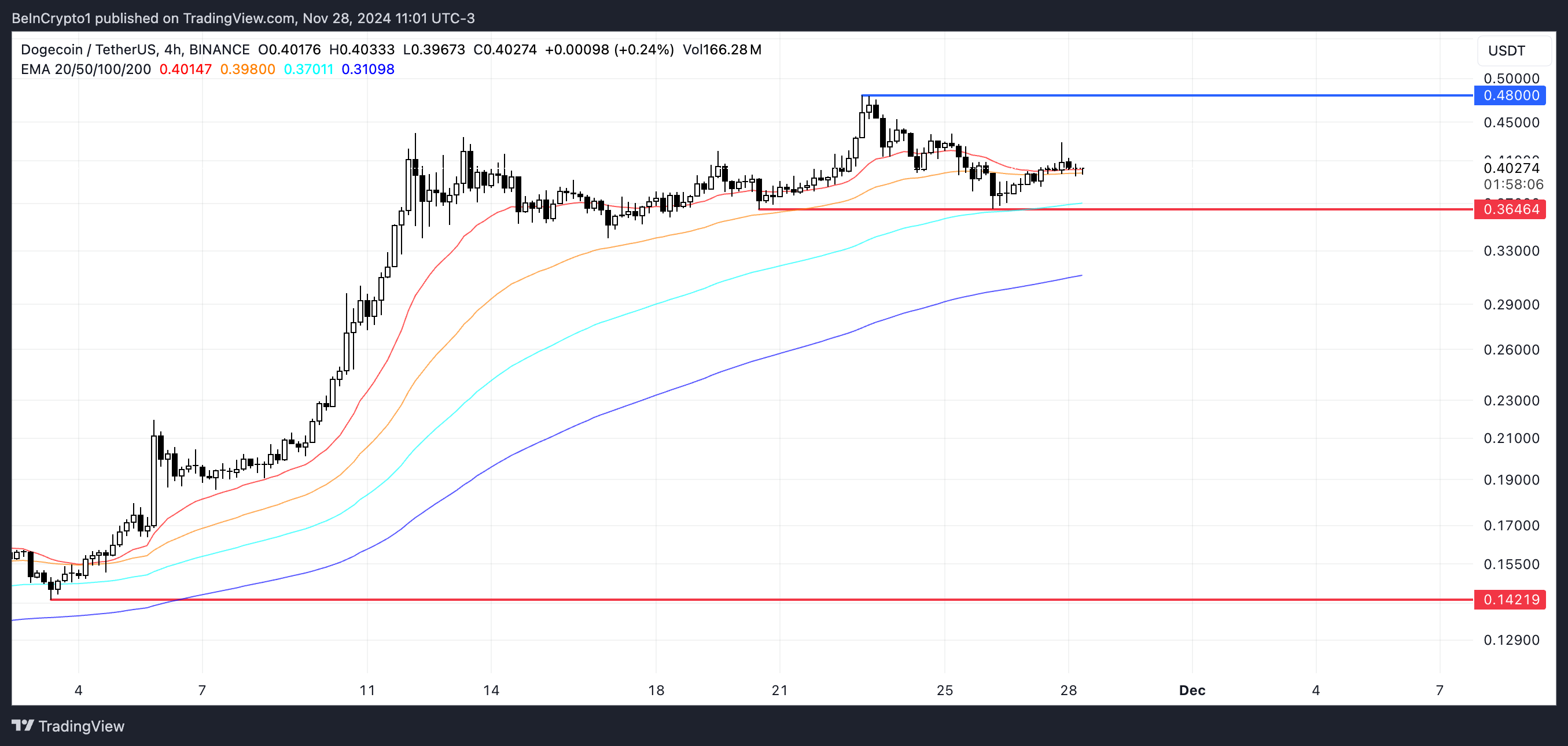 Namun, garis EMA DOGE menunjukkan bahwa tren saat ini mungkin berbalik menjadi tren turun, karena pembentukan death cross bisa terjadi segera. Jika harga Dogecoin menembus di bawah level support kritis US$0,36, ini bisa turun lebih jauh ke US$0,14, menandai level terendah sejak awal November.