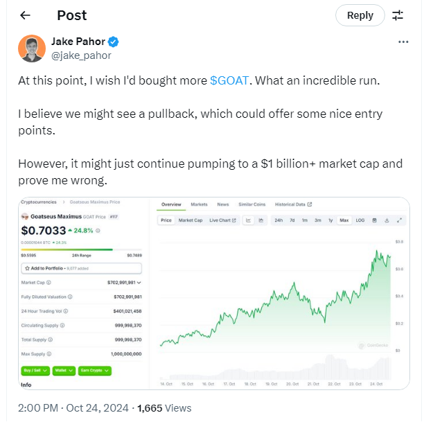 Analis Web3, Jake Pahor melalui utas X (Twitter) mengatakan, kinerja GOAT memperlihatkan pencapaian yang luar biasa. Meski begitu, ia berkeyakinan bahwa tren tersebut berpeluang memudar yang akan menawarkan titik masuk yang baik bagi investor.
