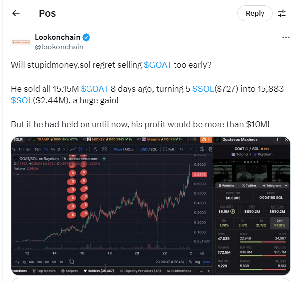 Melihat tren positif tersebut, salah satu trader dengan akun stupidmoney.sol berhasil meraup untung besar dalam kurun waktu 5 hari. Ia mengubah 5 token Solana (SOL) yang saat ini senilai US$727 atau sekitar Rp11 juta menjadi 15.833 SOL yang setara dengan US$2,44 juta (Rp38 miliar) melalui perdagangan 15,15 juta GOAT.
