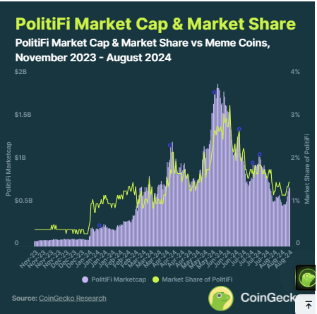 Barisan meme coin bertema politik, PolitiFi, berhasil mendapatkan sentimen positif dari musim politik di Amerika Serikat (AS). Riset yang dilakukan CoinGecko memperlihatkan sejak awal Januari sampai dengan 25 Agustus lalu, kapitalisasi pasar meme coin PolitiFi terbang 782,4% ke level US$680,8 juta.