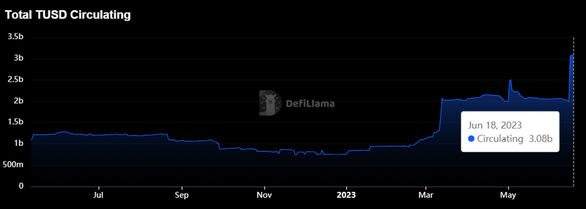 Perlu dicatat bahwa pasokan beredar TrueUSD (TUSD) telah naik dua kali lipat sejak awal tahun ini. Per tanggal 16 Juni saja, jumlahnya sudah mencapai lebih dari 3 miliar token. Per data dari DefiLlama, dalam kurun waktu satu minggu terakhir saja, kapitalisasi pasar TUSD telah melesat sebesar 51,14%.