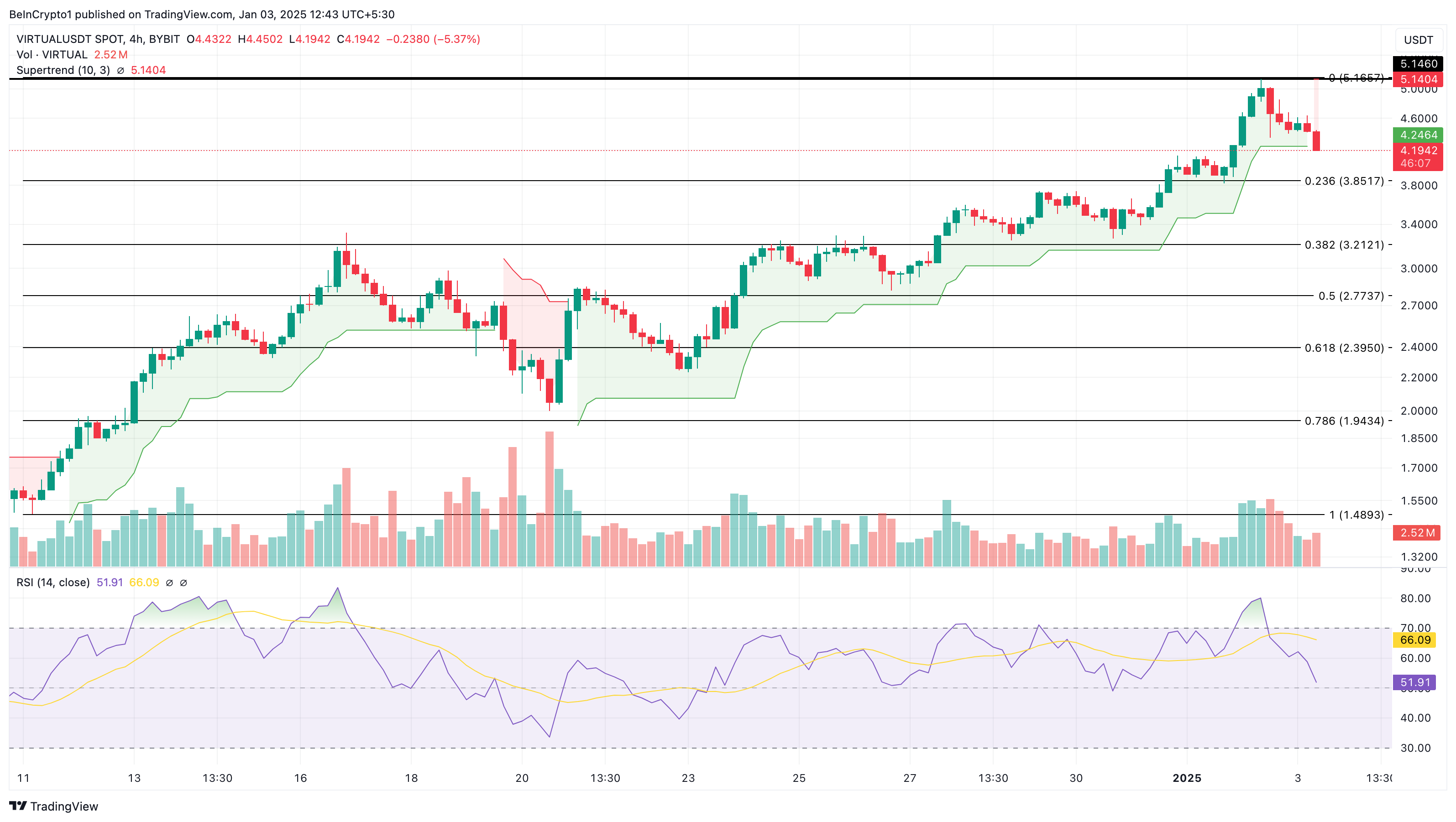 Tapi selain itu, indikator Supertrend, yang berperan penting dalam menemukan area beli dan jual, menunjukkan resistance di atas pada US$5,15. Jika segmen merah dari Supertrend tetap di atas harga VIRTUAL, maka altcoin ini bisa melihat penurunan ke US$3,85.