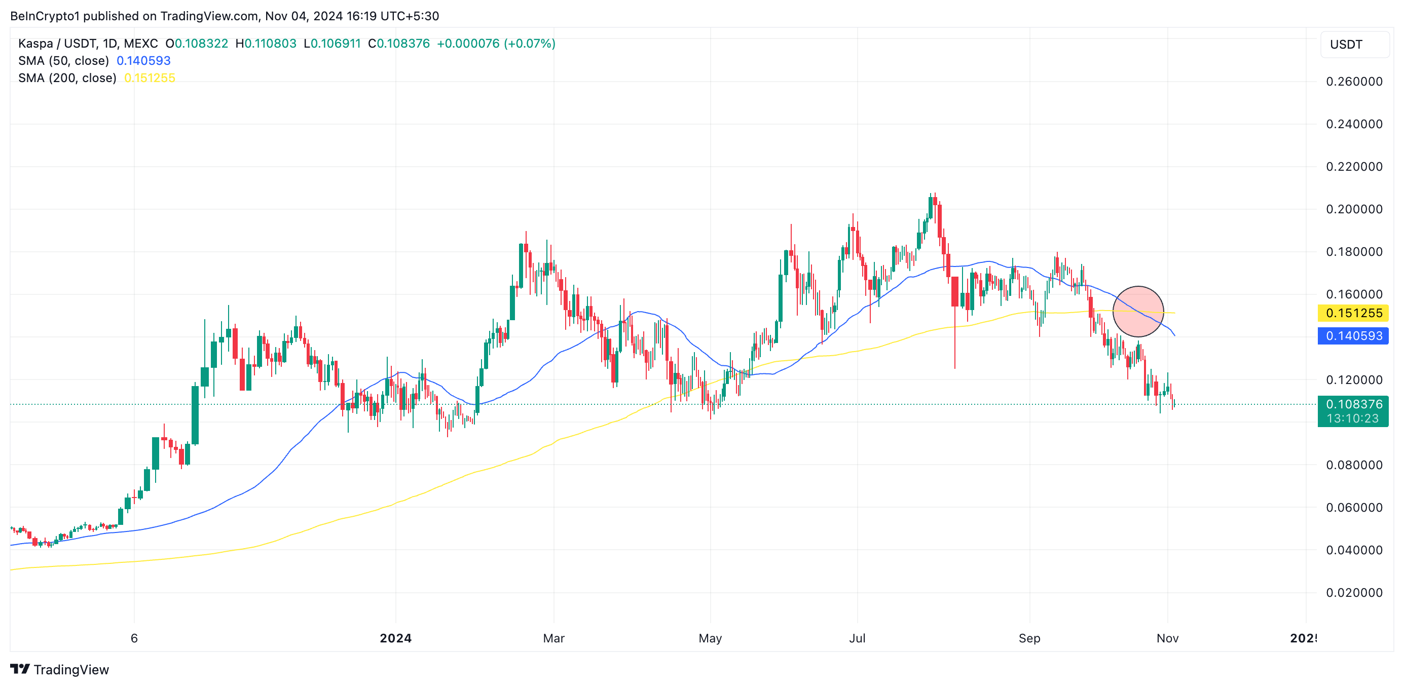 Penilaian BeInCrypto terhadap grafik harian KAS/USD menunjukkan pembentukan pola candlestick Death Cross pada 22 Oktober. Pola ini terbentuk ketika rata-rata pergerakan jangka pendek suatu aset (sering kali rata-rata pergerakan 50 hari) melintasi di bawah rata-rata pergerakan jangka panjangnya (umumnya rata-rata pergerakan 200 hari).