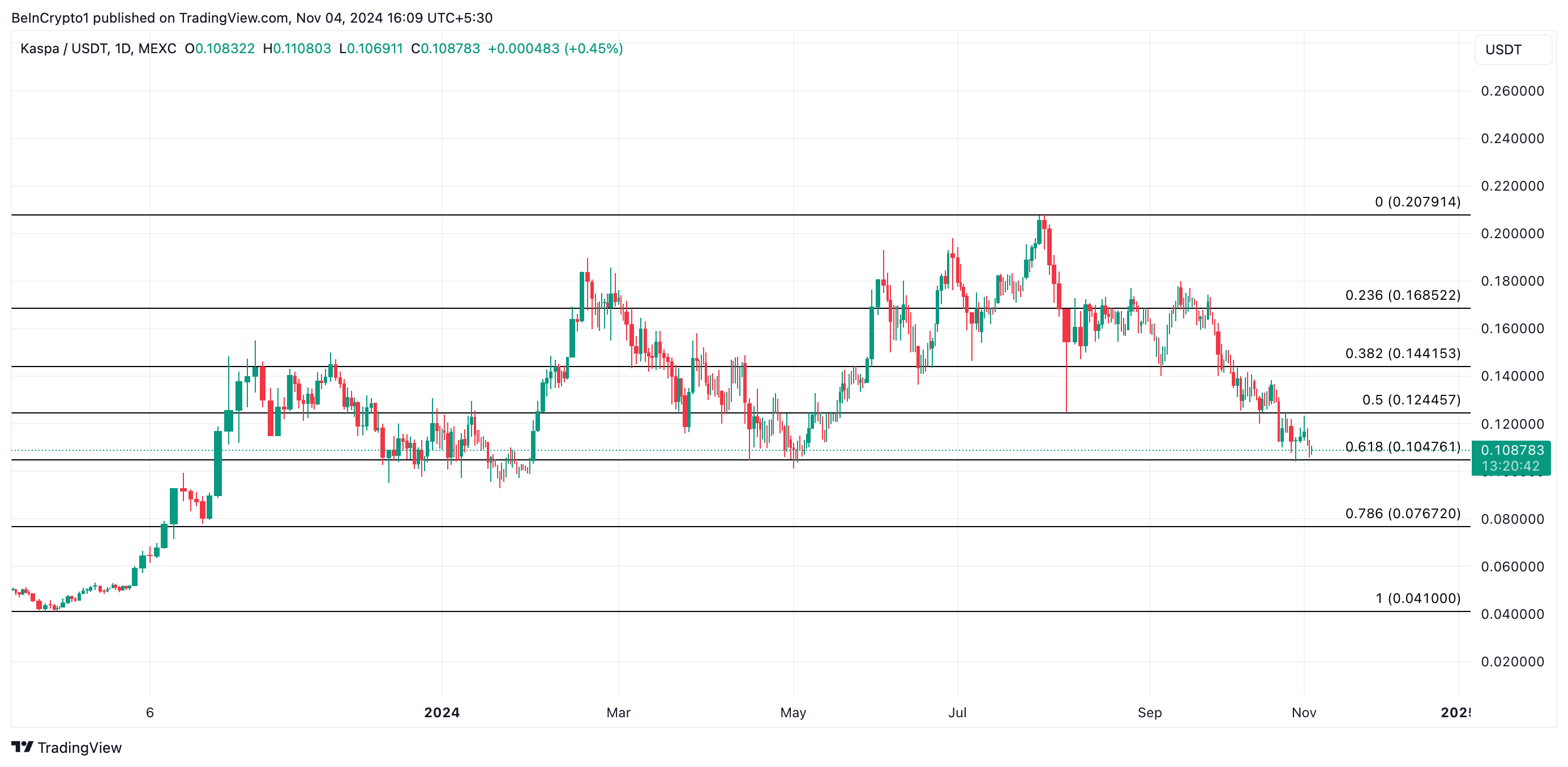 Saat ini, KAS diperdagangkan pada US$0,108, sedikit di atas support di US$0,104. Dengan tekanan jual yang meningkat, para pendukung koin mungkin kesulitan untuk mempertahankan level harga kritis ini. Penurunan di bawah US$0,104 akan memicu penurunan menuju US$0,076, level terendah yang terakhir terlihat pada November 2023.