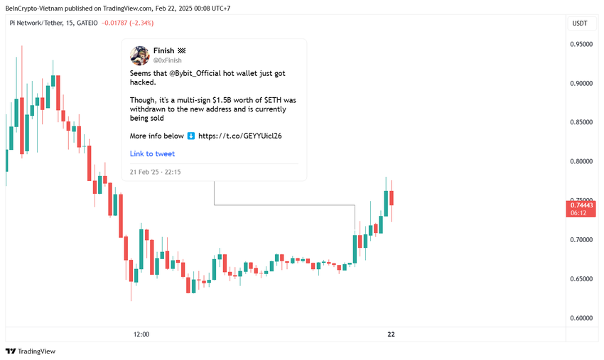 Berdasarkan data dari crypto exchange OKX, pada 22 Februari, harga PI diperdagangkan di angka US$0,65, namun seketika melesat 16% begitu kabar peretasan ByBit menyeruak.