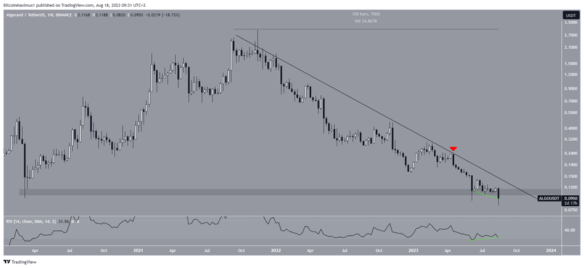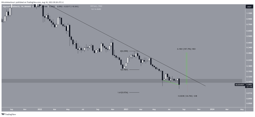 Meskipun harga ALGO sempat memantul di area support horizontal US$0,11, harganya akhirnya mengalami breakdown. Pada 17 Agustus, gelombang bearish melanda pasar kripto, dan harga ALGO pun harus terperosok hingga titik terendah sepanjang masa yang baru di US$0,08. Namun, meski telah tergelincir ke ATL baru, harga penutupan ALGO belum sampai berkisar di bawah area US$0,11. Oleh karena itu, potensi untuk bangkit kembali dan adanya tren bullish reversal masih tetap ada.