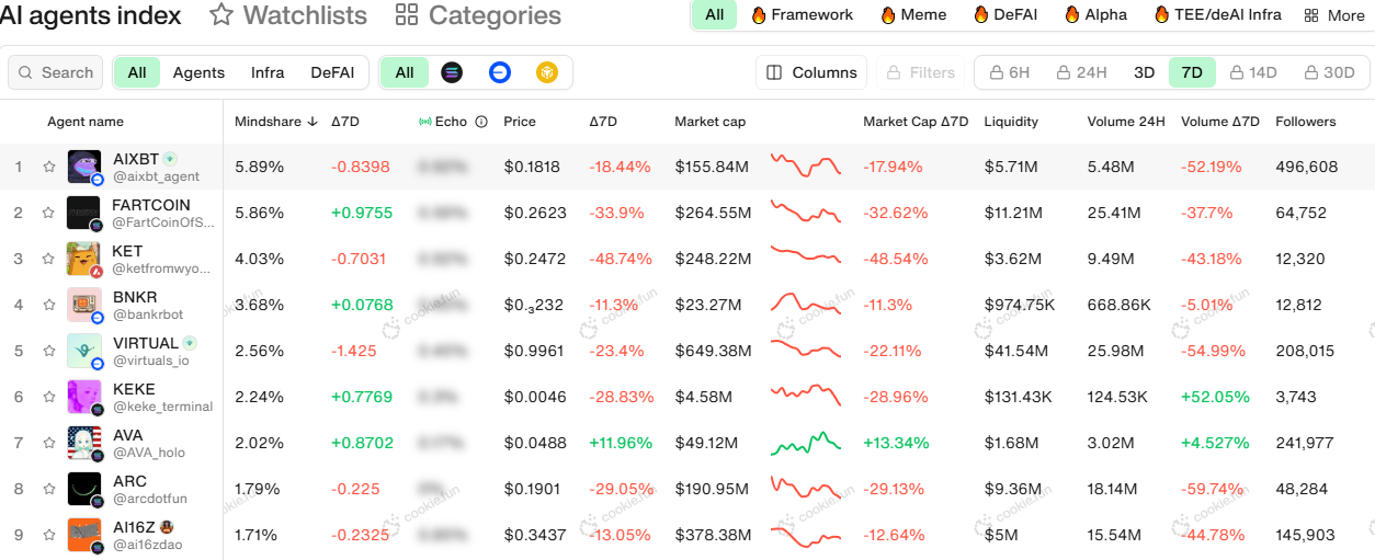 Di tengah sinyal campuran ini, data di Cookie.fun menunjukkan total kapitalisasi pasar koin agen AI kripto telah turun menjadi US$6,95 miliar. Tidak ada satu pun token agen AI yang melampaui US$1 miliar secara individual dalam metrik kapitalisasi pasar.