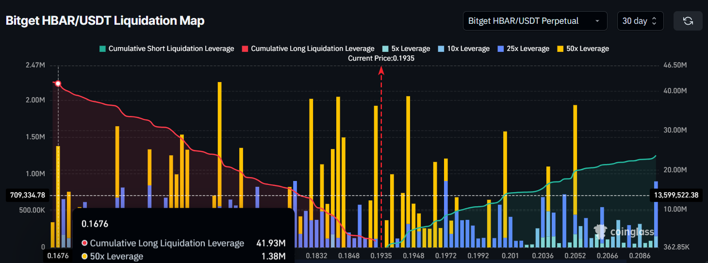 Momentum ekonomi makro yang lebih luas untuk HBAR beragam, menghadirkan peluang dan risiko. Peta likuidasi menunjukkan bahwa sekitar US$42 juta kontrak panjang berisiko jika harga HBAR turun ke US$0,167. Paparan ini menekankan pentingnya resistance US$0,200.