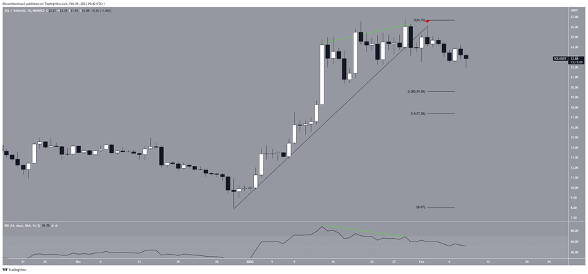 Analisis teknikal dari grafik harian menunjukkan bahwa harga token SOL sudah turun di bawah garis descending sejak bulan Agustus 2022. Garis tersebut telah menyebabkan terjadinya banyak aksi penolakan (ikon merah), dan yang terakhir kali terjadi pada 29 Januari. Akhirnya, pergerakan ini juga memicu dimulainya aksi penurunan yang masih berlangsung sampai saat ini.