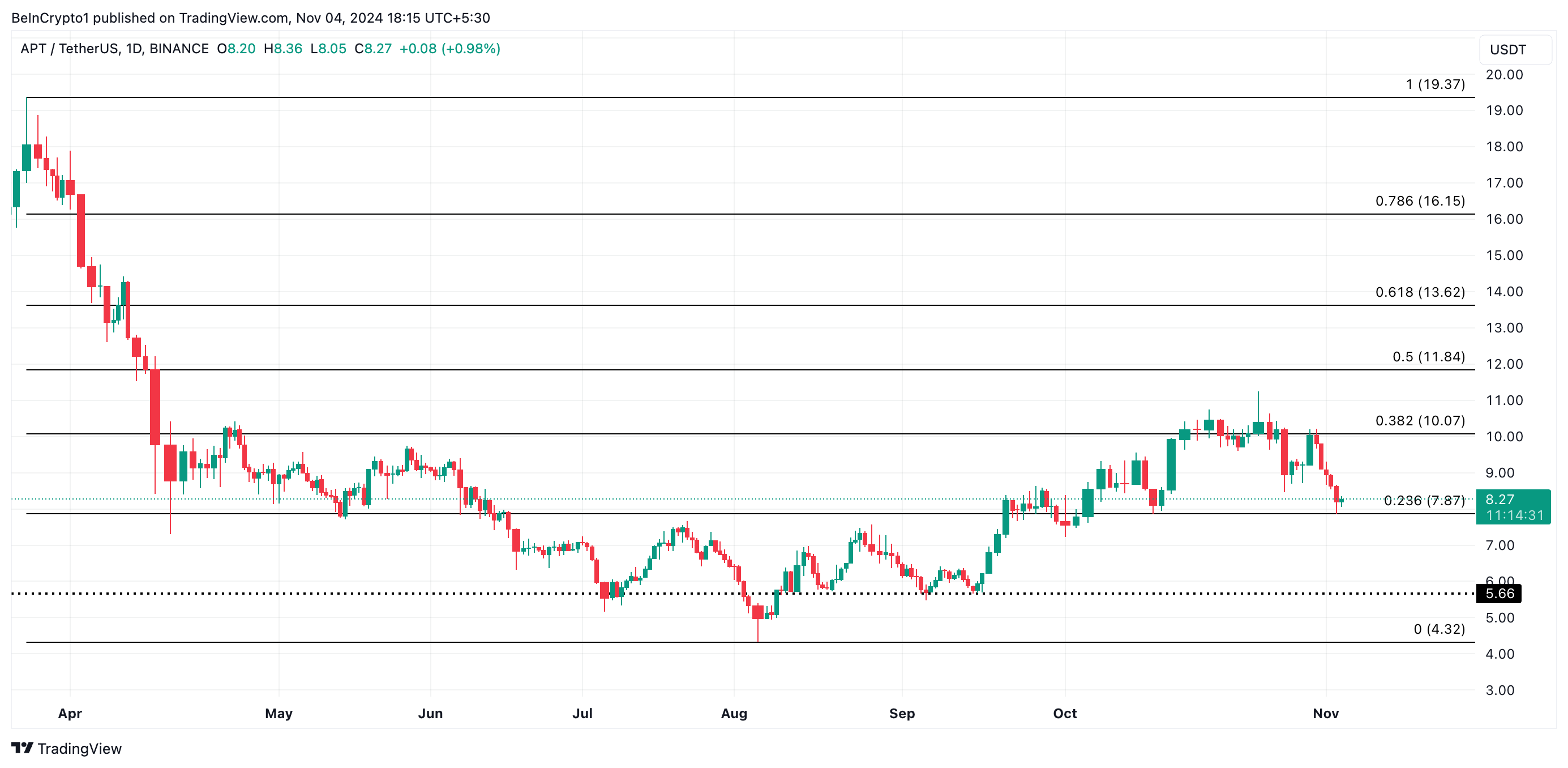 Pada waktu publikasi, APT diperdagangkan pada US$8,27, bertahan tepat di atas level support di US$7,87. Jika tekanan beli melemah, harga mungkin akan menguji support ini, dan kegagalan untuk bertahan bisa membuat APT turun lebih jauh ke US$5,66, di mana mungkin mencoba untuk membentuk basis support baru.