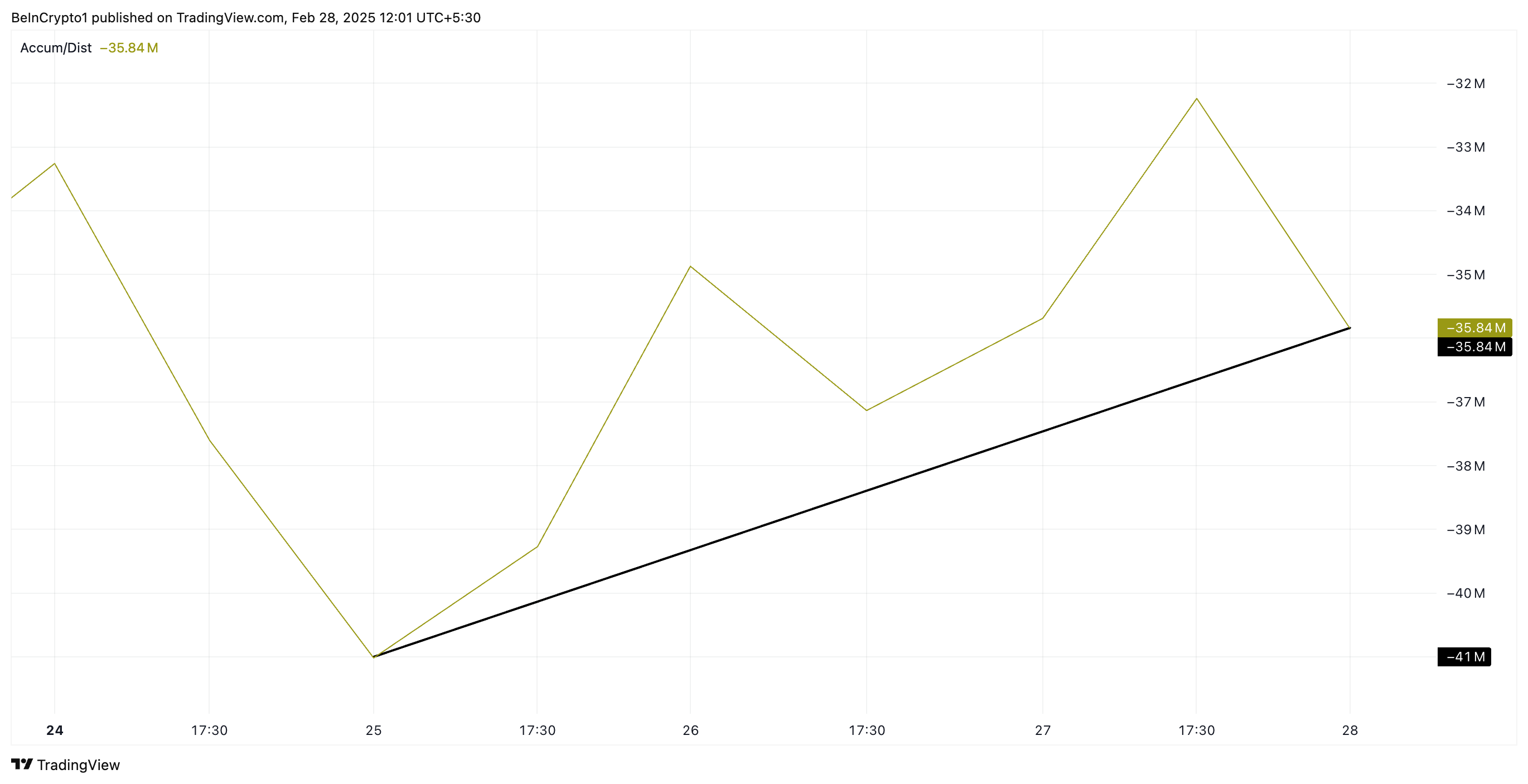 Ketika Garis A/D naik seperti ini, itu menunjukkan bahwa tekanan beli meningkat, menandakan bahwa lebih banyak trader mengakumulasi aset ketimbang menjualnya.
