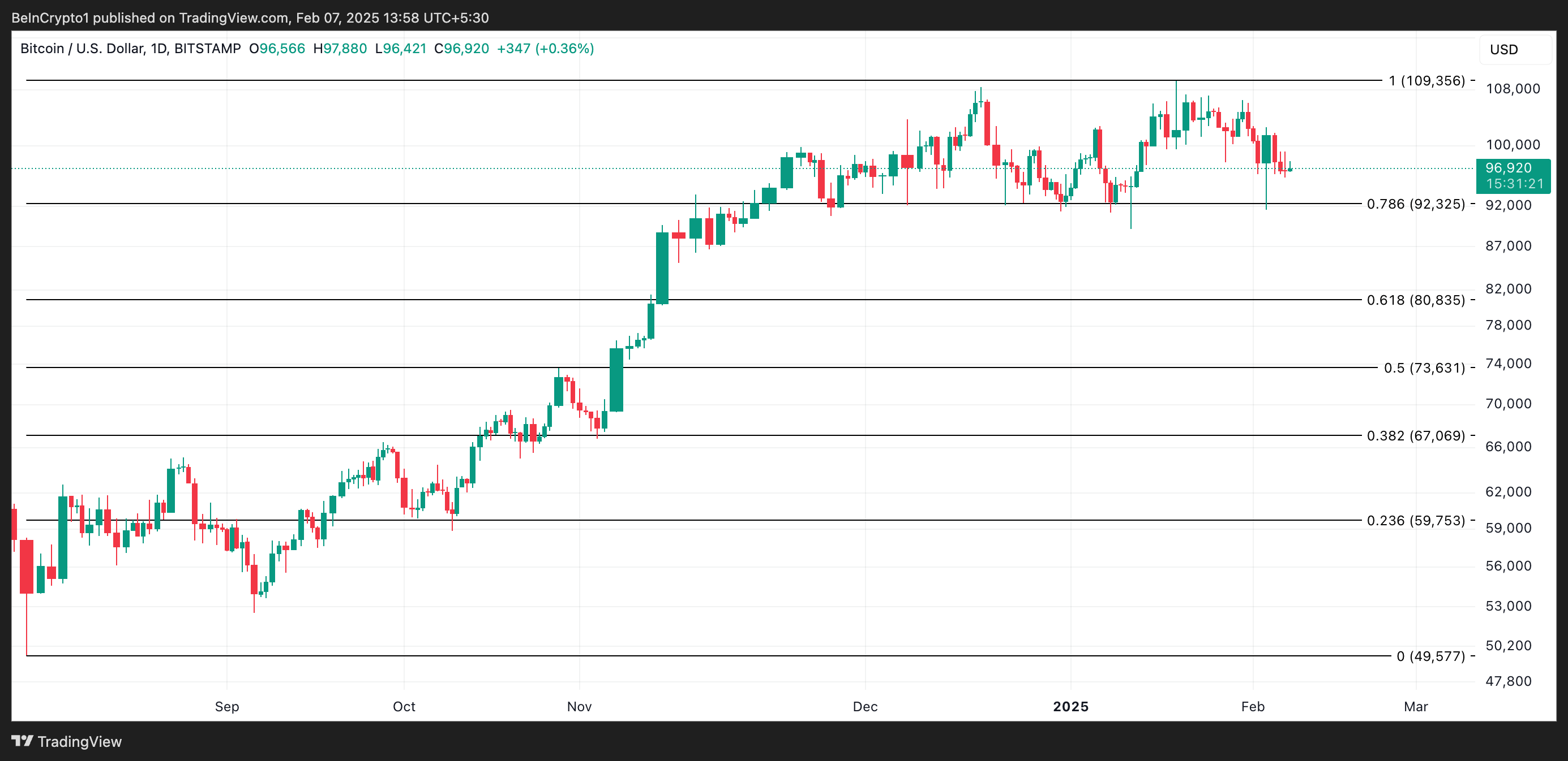 Bitcoin masih terkungkung di bawah level US$100.000 sejak awal Februari. Kini diperdagangkan di US$96.920, aset kripto nomor wahid ini mencatat koreksi 7% dalam sepekan terakhir.
