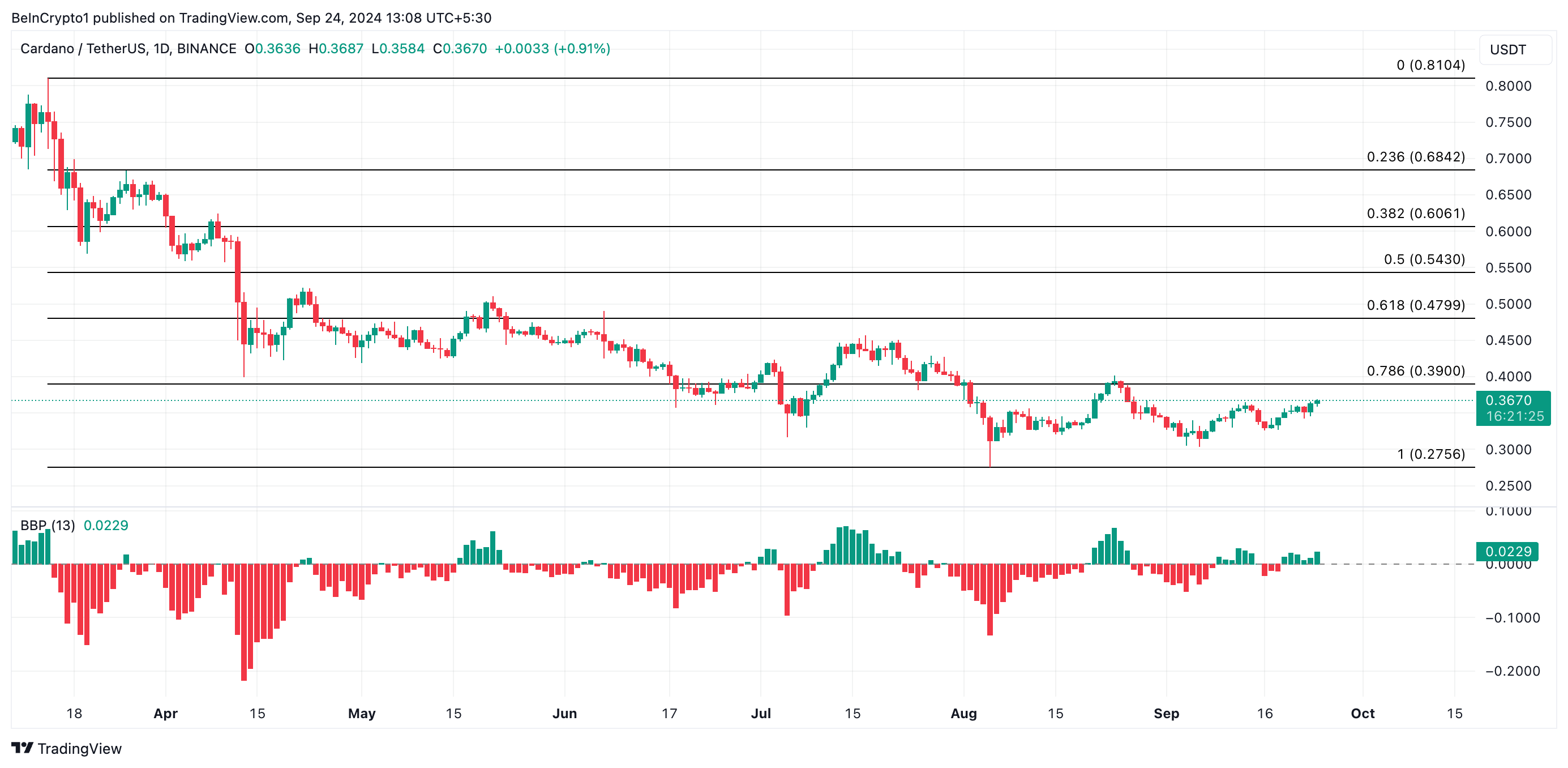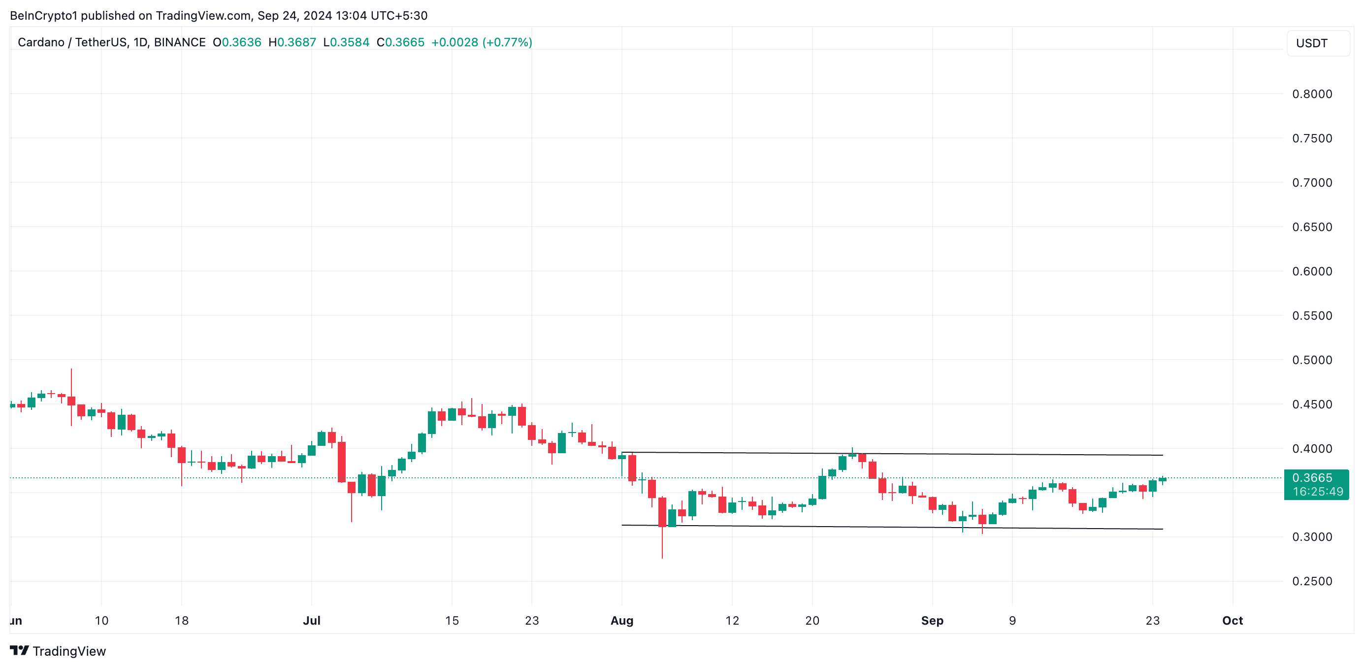 Sejak 1 Agustus, Cardano (ADA) telah berdagang dalam sebuah kanal horizontal, sebuah pola teknikal di mana harga bergerak antara dukungan dan resistensi yang ditentukan. Dalam hal ini, ADA menghadapi resistensi di US$0,40 dan menemukan dukungan di US$0,31, berfluktuasi dalam rentang sempit ini.