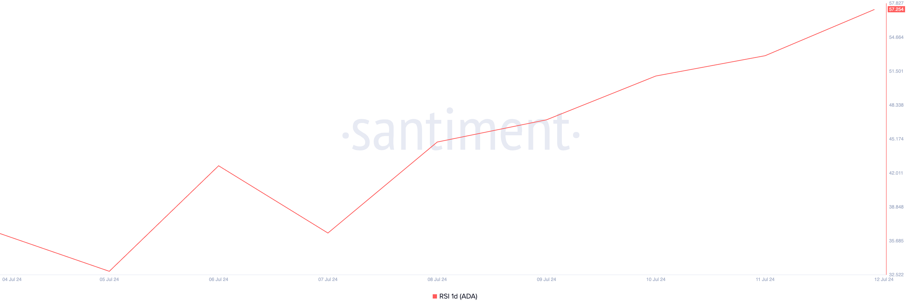 Selama minggu lalu, ADA mengalami lonjakan harga dua digit, mendorongnya mendekati batas atas kanal tersebut. Lonjakan ini menandakan permintaan yang meningkat untuk altcoin tersebut, yang didukung oleh Indeks Kekuatan Relatif (RSI) nya. Dengan RSI 57,25, ini menunjukkan momentum bullish yang tumbuh seiring semakin banyaknya partisipan pasar yang mengumpulkan ADA.