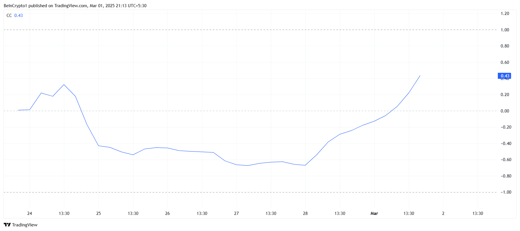 Korelasi KAITO dengan Bitcoin semakin meningkat, menunjukkan bahwa KAITO mengikuti tren pasar Bitcoin dengan lebih dekat. Peningkatan korelasi ini menunjukkan bahwa pergerakan harga KAITO semakin selaras dengan aksi BTC.