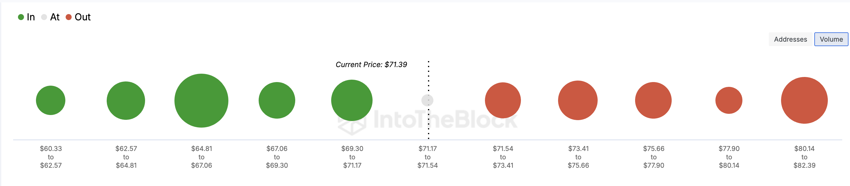 Berdasarkan metrik In/Out of Money Around Price (IOMAP), sekitar 840.000 alamat LTC membeli koin mereka antara US$71,54 dan US$81,14. Ini menunjukkan bahwa holder ini masih “underwater,” karena harga LTC saat ini masih di bawah level masuk mereka.
