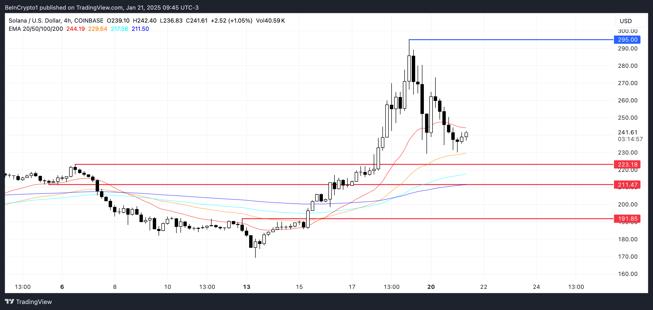 Garis EMA untuk SOL mempertahankan pengaturan bullish, dengan rata-rata jangka pendek berada di atas rata-rata jangka panjang, menandakan momentum naik yang berkelanjutan. Namun, celah yang menyempit antara garis-garis ini menunjukkan melemahnya kekuatan dalam tren, yang menunjukkan potensi pembalikan.