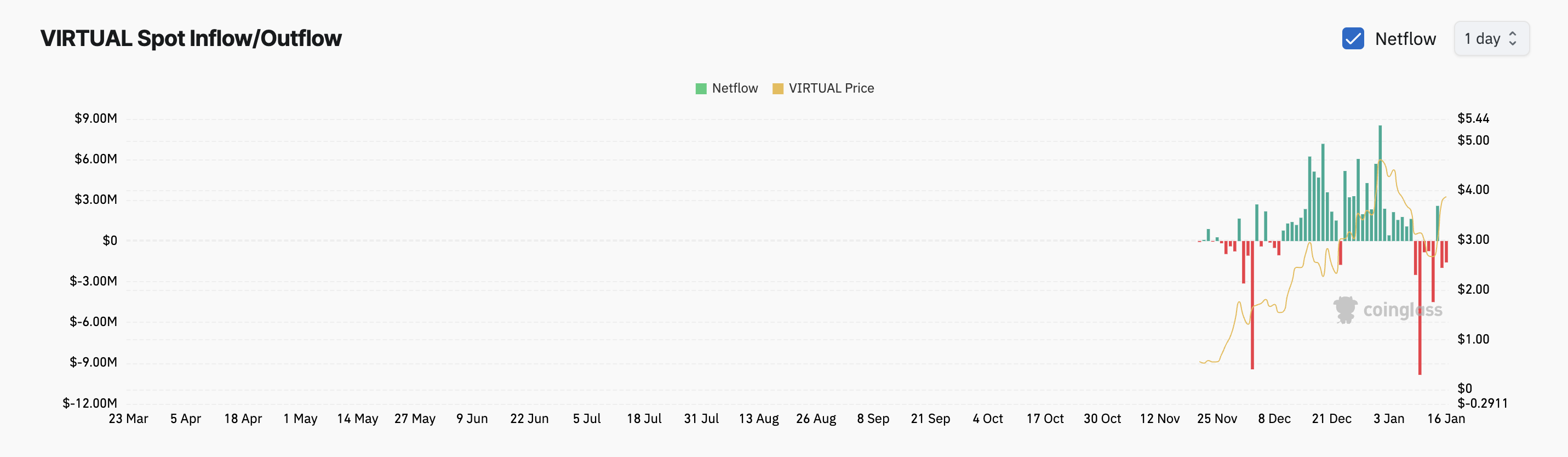 Namun, arus keluar yang terus-menerus dari pasar spotnya selama dua hari terakhir menimbulkan kekhawatiran. Menurut Coinglass, pasar spot VIRTUAL telah mengalami arus keluar sebesar US$4 juta selama periode ini, menunjukkan penjualan.