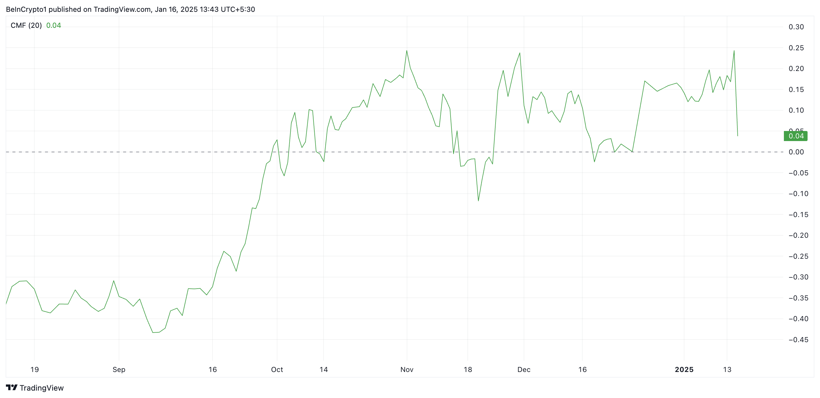 Ketika harga suatu aset naik sementara CMF-nya turun, tekanan beli yang kuat tidak mendukung pergerakan harga ke atas. Ini menunjukkan bahwa reli lebih didorong oleh faktor jangka pendek daripada permintaan yang berkelanjutan, dan mungkin ada potensi pembalikan atau pelemahan dalam tren harga.