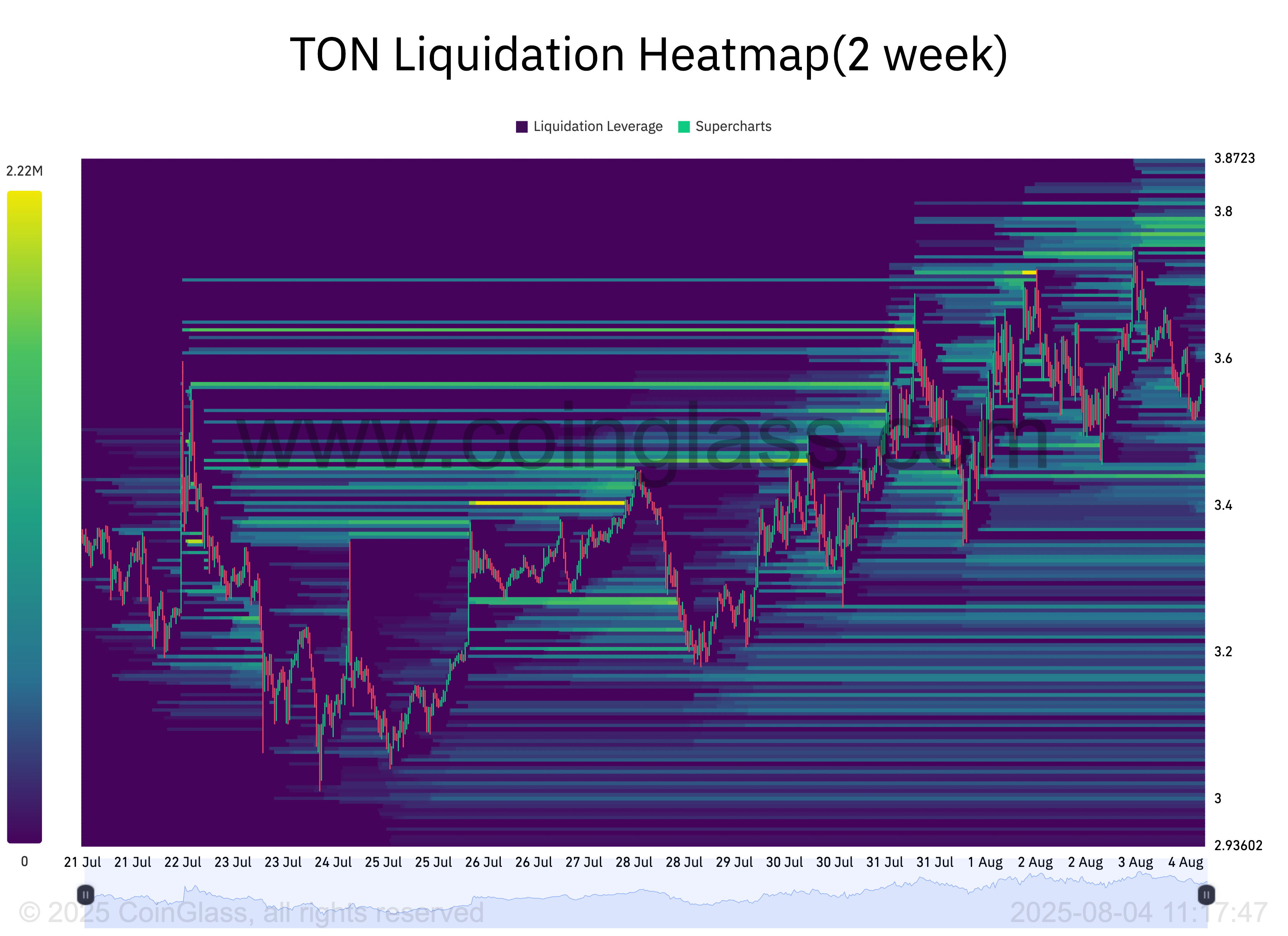 Menurut Coinglass, peta panas likuidasi TON menunjukkan konsentrasi likuiditas yang signifikan di sekitar zona harga US$3,77.