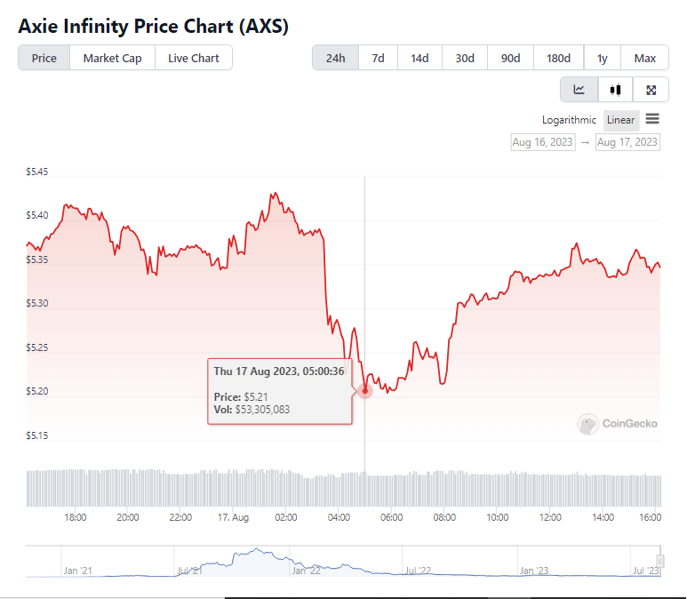 Merespon hal itu, pergerakan harga native token Axie Infinity (AXS) sempat melorot 3,33% ke level US$5,21 dari posisi sebelumnya US$5,39 di hari yang sama (17/8). Namun, jika kita amati selama 24 jam terakhir, perdagangan token AXS hanya terkoreksi sebanyak 0,5%.