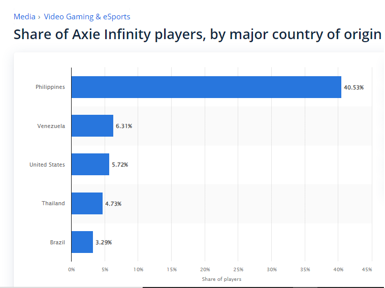 Peringatan yang dilontarkan oleh otoritas penegak hukum Filipina menjadi anomali. Pasalnya, selama ini, pangsa pasar terbesar dari pelopor game P2E tersebut ada di Filipina. Sebanyak 40,53% dari total pemain Axie di seluruh dunia datang dari negeri yang dijuluki sebagai Lumbung Padi Asia Tenggara itu.