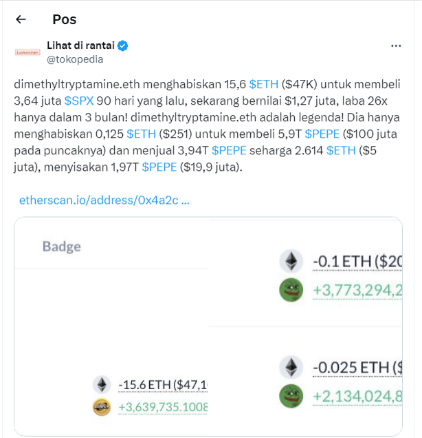 Tidak hanya itu, dalam perdagangan lainnya, trader tersebut juga terekam sukses memanfaatkan meme coin Pepe (PEPE) untuk mendulang keuntungan. Lookonchain menyebut awalnya trader tersebut menjual 0,125 ETH yang setara dengan US$251 atau setara dengan Rp3,93 juta.