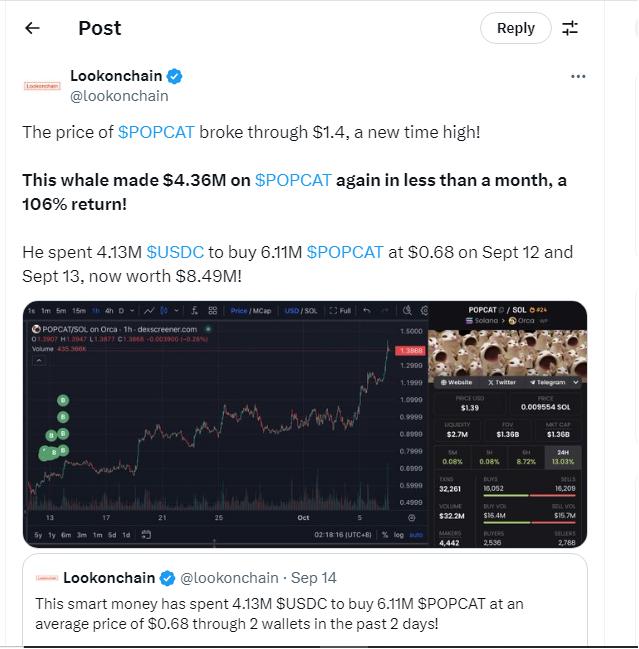 Awalnya ia menghabiskan 4,13 juta USDC atau setara dengan Rp64,66 miliar untuk memborong token POPCAT di harga US$0,68 pada 12 dan 13 September kemarin. Namun beberapa hari setelahnya, nilai investasi trader tersebut sudah mencapai US$8,49 juta yang memperlihatkan keuntungan sekitar 106%.