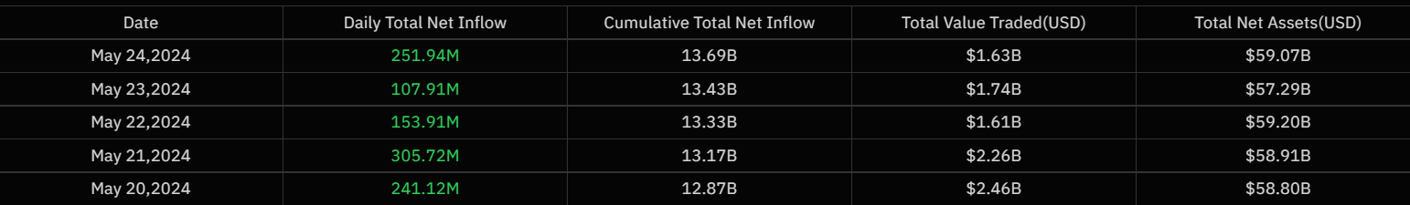 Data SoSo Value mengungkit bahwa per 24 Mei, ETF Bitcoin spot AS membukukan total arus masuk bersih sebesar US$251,94 juta. Angka ini menandai 10 hari berturut-turut masuknya aliran dana ke ETF. Pada hari yang sama, iShares Bitcoin Trust (IBIT) milik BlackRock dan Fidelity Wise Origin Bitcoin Fund (FBTC) masing-masing mengantongi arus masuk sebesar US$182 juta dan US$44 juta.
