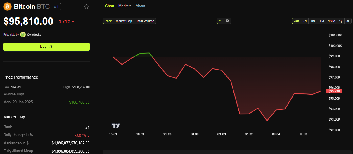 Data BeInCrypto menunjukkan BTC diperdagangkan pada US$95.810 pada saat penulisan. Hanya mengalami pemulihan kecil sejak sesi Senin berjalan.