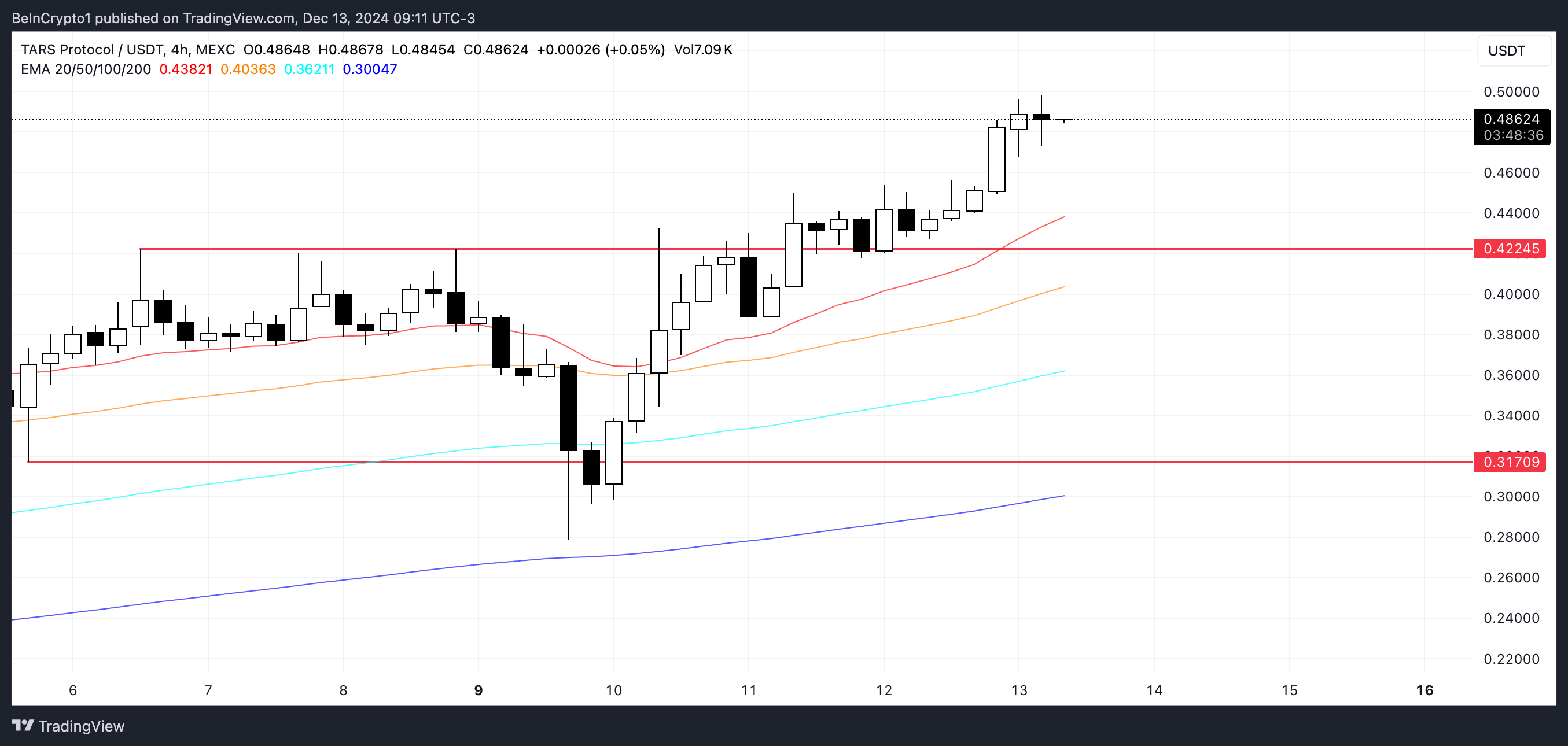 Harganya melonjak lebih dari 26% dalam tujuh hari terakhir dan lebih dari 230% dalam 30 hari terakhir. Jika tren naik berlanjut, TARS bisa menembus di atas US$0,50 dan berpotensi mencapai US$0,75 atau bahkan US$1 dalam waktu dekat.