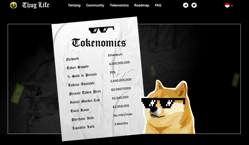 Akan ada total pasokan yang layak dijadikan meme sebanyak 4,2 miliar token $THUG, dengan 70% di antaranya (2,94 miliar token) tersedia untuk dibeli selama masa presale dengan harga masing-masing US$0,0007.