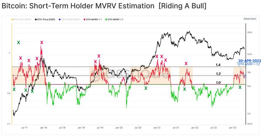 Di samping itu, Glassnode juga menganalisis rasio MVRV (market-value-to-realized-value), yang mengukur kapitalisasi pasar versus kapitalisasi yang terealisasi. Atau dengan kata lain, rasio antara harga spot dan basis biaya on-chain.