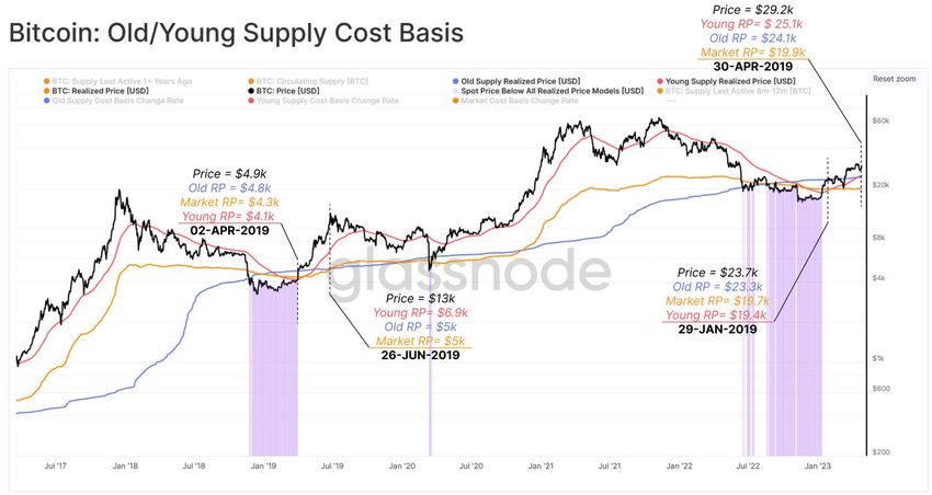 Glassnode mengategorikan “pasokan Muda” sebagai koin yang dipegang dalam tempo kurang dari enam bulan dan “pasokan Tua” sebagai koin yang dipegang lebih lama dari kurun waktu tersebut.