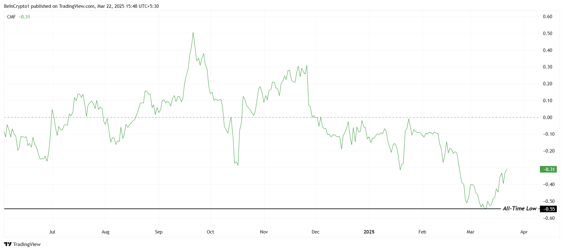Momen makro Tornado Cash menunjukkan tantangan lebih lanjut. Indikator Chaikin Money Flow (CMF), yang mengukur rata-rata volume tertimbang dari akumulasi dan distribusi, saat ini terjebak di zona bearish.