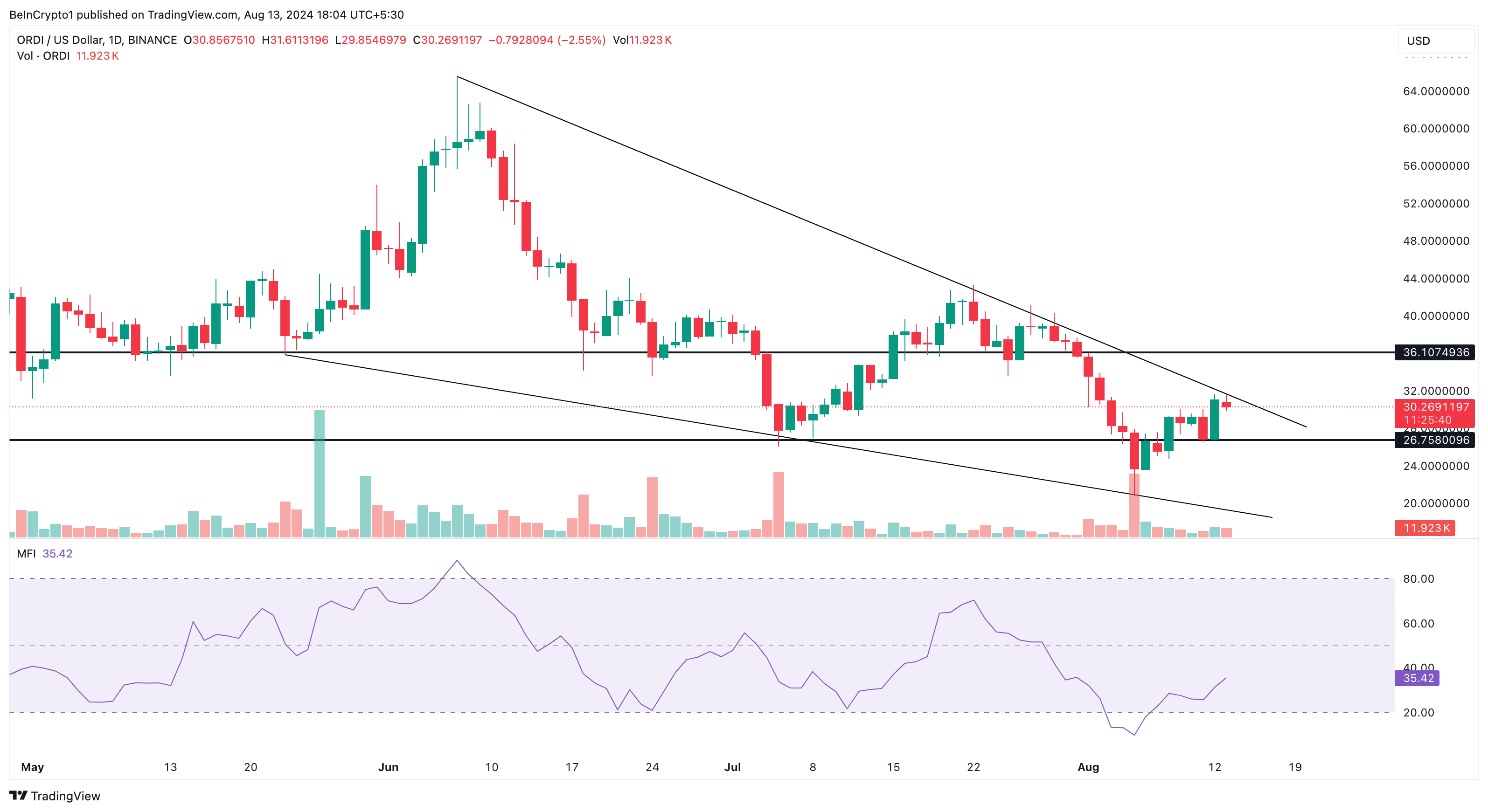 Jika arus uang menanjak, harga ORDI mungkin akan mendekati level resistance di US$36,10. Namun, jika tekanan beli malah melemah, proyeksi bullish ini menjadi tidak valid lagi, sehingga menyeret harga turun ke US$26,75.