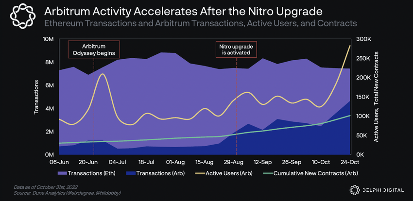 Berkat upgrade Nitro yang sukses tayang pada 31 Agustus lalu, jumlah aktivitas di jaringan Arbitrum pun mengalami peningkatan. Hal ini karena upgrade tersebut mampu membuat transaksi di Arbitrum menjadi jauh lebih murah dan juga lebih cepat. Grafik di bawah ini menunjukkan bahwa angka total smart contract baru telah meningkat pesat sejak upgrade tersebut sukses terlaksana. Selain itu, aktivitas rata-rata smart contract baru di Arbitrum juga telah melonjak dari 1.800 per minggu menjadi 6.000 per minggu.