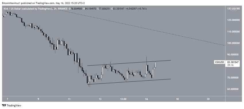 Kemudian, grafik dalam rentang waktu 2 jam menunjukkan bahwa KSM diperdagangkan tepat di atas garis resistance dari ascending channel yang sudah berada di sana sejak 12 Mei.