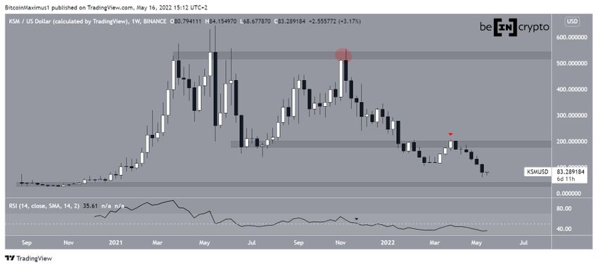 Harga Kusama mulai jatuh dalam kecepatan yang terakselerasi sejak bulan November 2021. Hal tersebut terjadi ketika koin ini baru saja menyentuh titik US$554 (lihat lingkaran merah pada gambar). Penurunan itu terus menciptakan titik tertinggi yang lebih rendah, hingga level tertinggi selama bulan Mei ini, sekaligus memvalidasi area US$530 sebagai resistance. Harga KSM belum pernah mencapai penutupan di atas area ini.