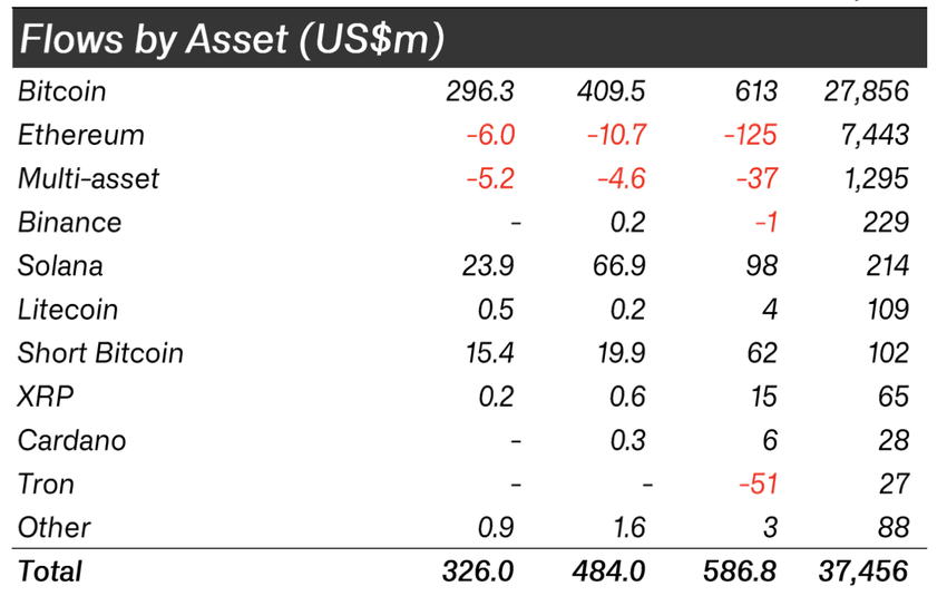 Total dana sebesar US$326 juta mengalir ke produk investasi aset digital, dengan Bitcoin (BTC) yang menyumbang 90% dari jumlah tersebut.