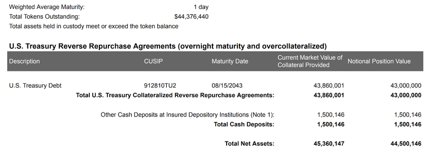 Tangkapan layar yang diambil dari laporan transparansi Paxos di bawah ini menunjukkan bahwa ada total 44.376.440 PYUSD yang saat ini beredar. Jumlah token beredar ini didukung oleh aset dengan nilai sekitar US$45.360.147 yang terdiri dari “Perjanjian Pembelian Kembali yang dijaminkan oleh Departemen Keuangan AS”, serta “deposit tunai di institusi penyimpanan yang diasuransikan.”