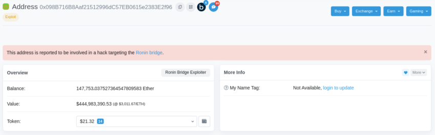 Menurut data dari Etherscan, alamat dompet yang sudah ditandai sebagai “Ronin Bridge Exploiter” memiliki saldo sebesar 147.753,03 ETH atau sekitar US$444 juta, pada saat artikel ini ditulis.
